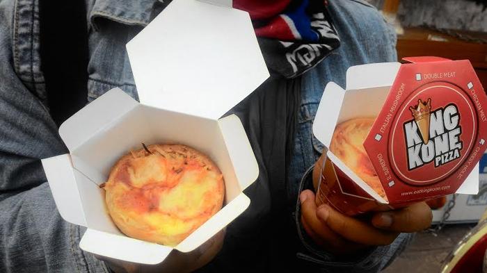 Ini pizza langka! Lazimnya kan pizza berbentuk bundar, tapi produk pizza dari King Kone Pizza ini kerucut!