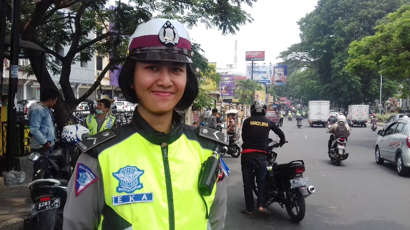 Adalah Bripda Eka Sri Rahayu, polwan dari Polres Bogor Kota ini menindak tegas para pengendara motor yang melanggar aturan.