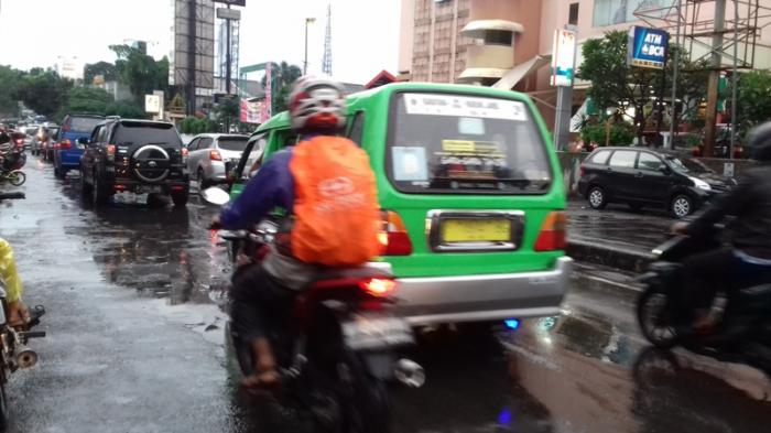 Kendaraan tersendat karena banyaknya angkutan kota (angkot) yang mangkal di depan Plaza Jambu Dua.