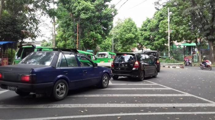 Kendaraan tersendat karena banyaknya angkutan kota (angkot) yang mangkal di depan Plaza Jambu Dua.