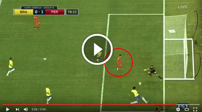 Menyambut umpan dari sisi kanan, Ruidiaz langsung menyambar bola tepat di depan gawang Brasil.