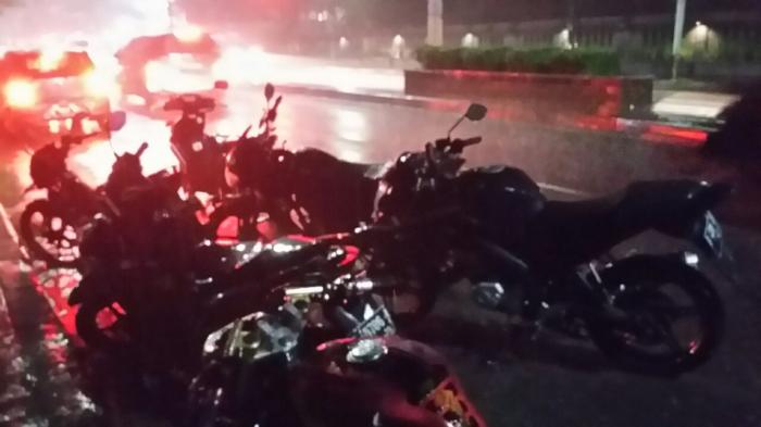 TRIBUNNEWSBOGOR.COM, CIBINONG - Hujan deras yang mengguyur wilayah Bogor pada malam ini membuat sejumlah pengendara sepeda motor tidak bisa melintas.