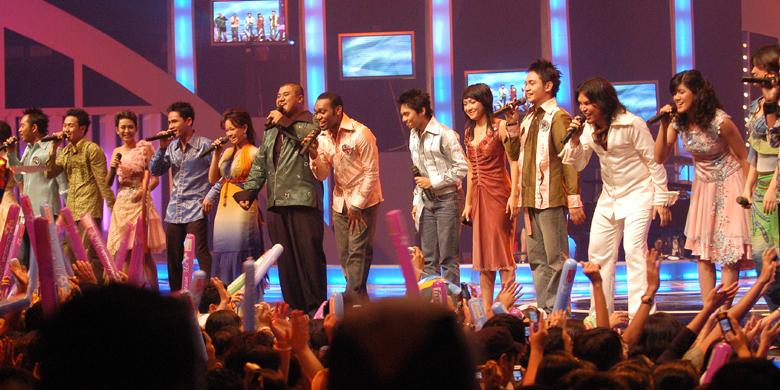Para finalis Indonesian Idol 1 dan 2 bernyanyi bersama pada acara Result and Reunion Indonesia Idol 2 di Jakarta Convention Center (JCC), Sabtu (13/8/2005). Michael Prabawa Mohede (Mike) menjadi pemenang Indonesian Idol 2 mengalahkan Judika Nalom Abadi Sihotang (Judika).
