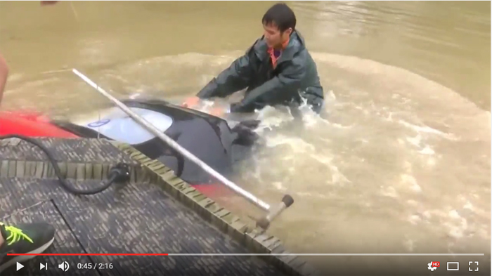 Tampak dalam video itu, beberapa pria mendekati mobil yang sudah setengah tenggelam itu menggunakan perahu.