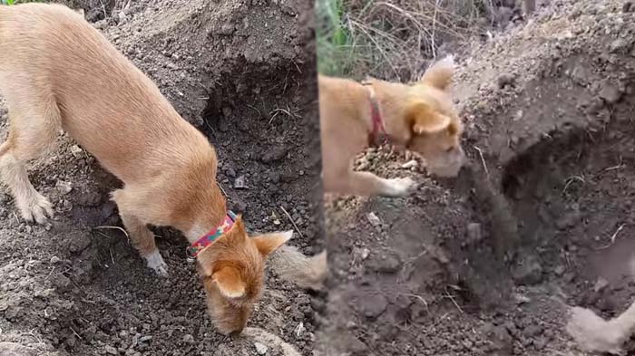 Video itu menunjukkan anjing cokelat tersebut berulang kali menyekop tanah dengan hidungnya menjadi kuburan dangkal.