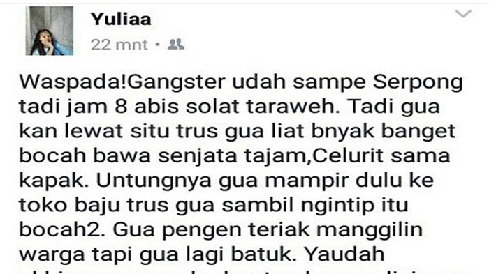 "Waspada! Gangster udah sampe Serpong tadi malam jam 8 abi solat taraweh.