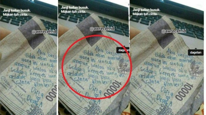 "Aku berjanji tidak akan membelikan uang ini untuk apapun, walau aku sedang kepepet, uang ini adalah janji bisu cinta kita ber-2..