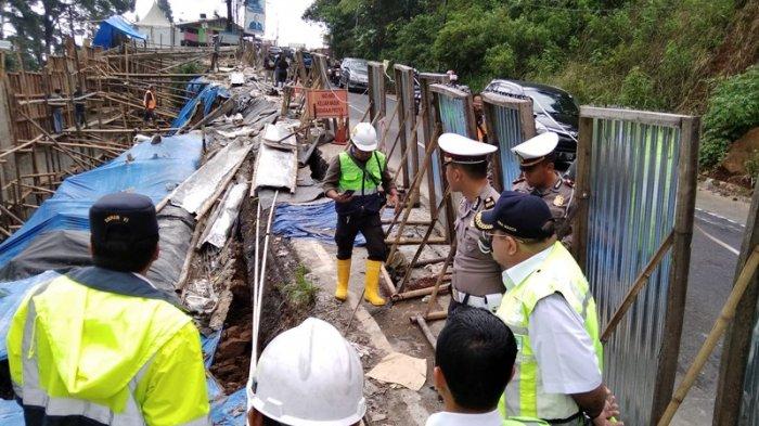 TRIBUNNEWSBOGOR.COM, CISARUA - Balai Besar Pelaksanaan Jalan Nasional (BBPJN) VI Kementerian Pekerjaan Umum dan Peruhaman Rakyat (PUPR) meninjau keretakan tanah dari pengerjaan proyek di Jalan Raya Puncak, Kecamatan Cisarua, Kabupaten Bogor, tepatnya di kawasan Riung Gunung.