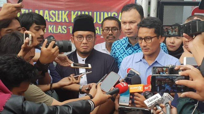TRIBUNNEWSBOGOR.COM -- Calon Wakil Presiden (cawapres) nomor urut 02, Sandiaga Uno, dan Koordinator Jubir Badan Pemenangan Nasional (BPN) Prabowo-Sandi, Dahnil Anzar Simanjuntak, mengunjungi Ahmad Dhani di Lapas Cipinang, Jakarta.