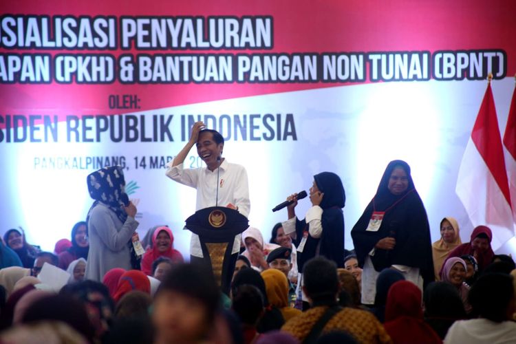 Momen itu terjadi ketika Presiden Jokowi membagikan 1.250 Program Keluarga Harapan ( PKH) di Sasana Kasih, STMIK Atma Luhur, Kota Pangkalpinang, Bangka Belitung, Kamis (14/3/2019) siang.