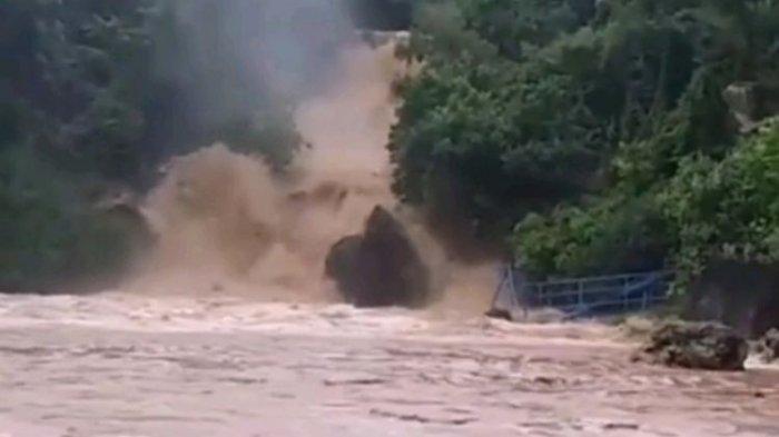 TRIBUNNEWSBOGOR.COM -- Hujan deras menyebabkan sungai yang bermuara di kawasan Pantai Baron, Kecamatan Tanjungsari, Gunungkidul, Yogyakarta, meluap dan menyebabkan banjir, Minggu (17/3/2019) malam.