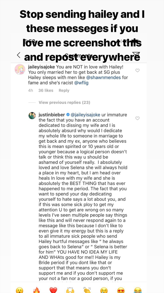 Ia membalas komentar tersebut dan menjelaskan jika Hailey Baldwin dan Selena Gomez punya arti masing-masing untuk dirinya.