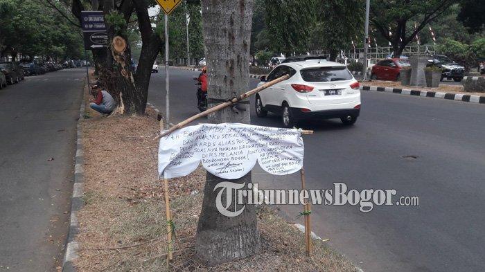Spanduk tersebut terpampang di sebuah pohon di kawasan Jalan Tegar Beriman, Cibinong, Kabupaten Bogor.