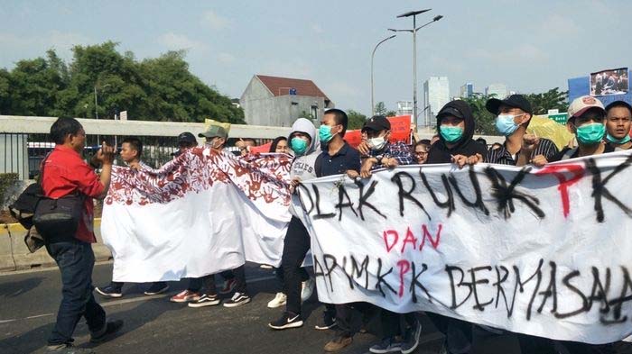Mereka berjalan dari arah kawasan Semanggi. Tuntutan mereka sama, meminta DPR dan Pemerintah menunda pengesahan RUU KPK dan RKUHP.