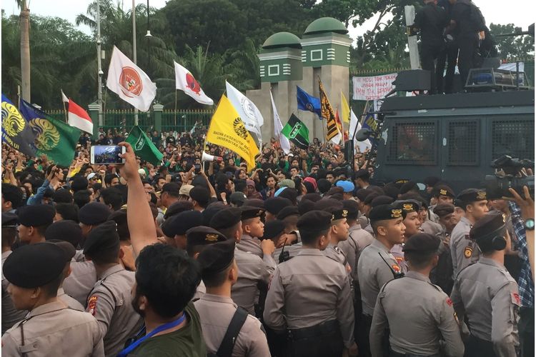 “Jangan terprovokasi adik-adik, di tengah-tengah kalian ada provokator. Mohon jangan terprovokasi, teman kalian sudah ada yang audensi,” ujar Kapolres Jakarta Pusat Kombes Pol Harry Kurniawan dari atas mobil water canon, Senin.