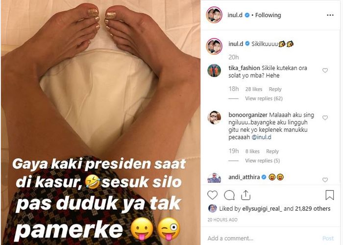 "yehhh ternyata bentuk kaki nya si cantik tenan iki bagusss sekali driji nya indah panjang2 bagus deh mbak," tulis @liemsioing yang justru memuji kaki inul.