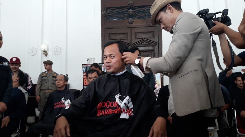 Bima Arya juga turut andil dengan ikut mencukur rambutnya di teras Balaikota Bogor.