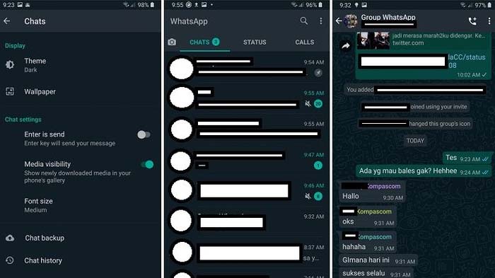 Saat mode gelap aktif, warna gelap akan mendominasi seluruh tampilan WhatsApp, mulai dari beranda hingga ruang obrolan.