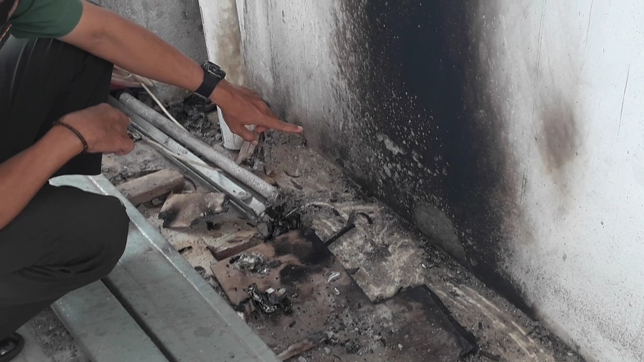 Tembok beserta tumpukan kabel di lokasi tampak menghitam setelah terbakar dalam kejadian ini.
