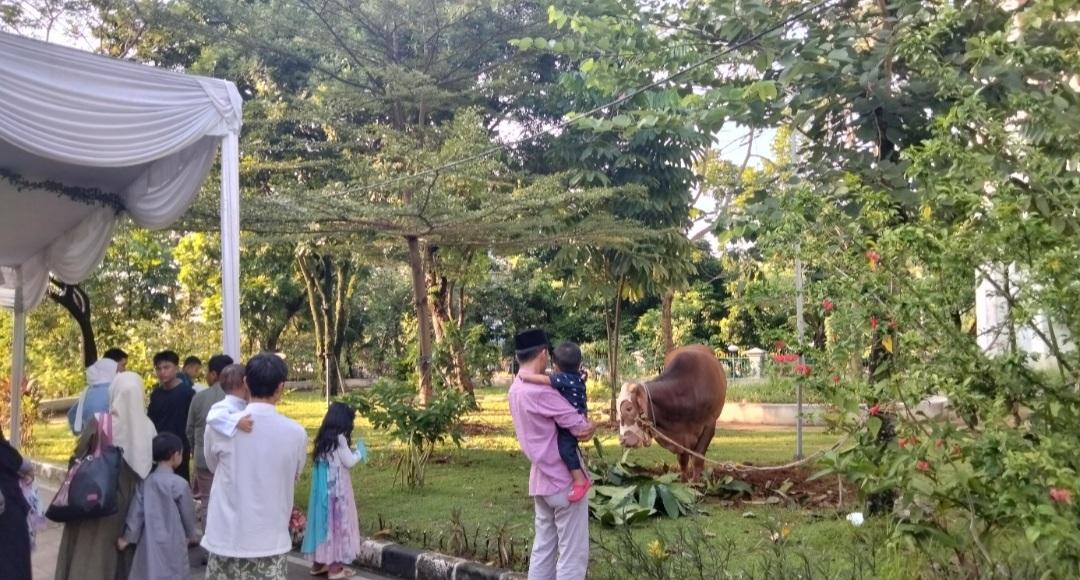 Usai melaksanakan sholat Idul Adha di Masjid Baitul Faidzin, sejumlah warga silih bergantian melihat sapi itu.