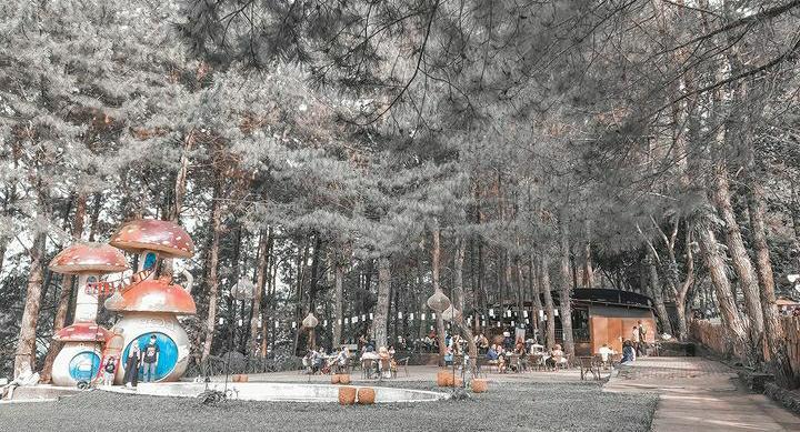 Di tengah hutan pinus yang asri kamu bisa makan dan minum kopi dengan background alam bersama pasangan.