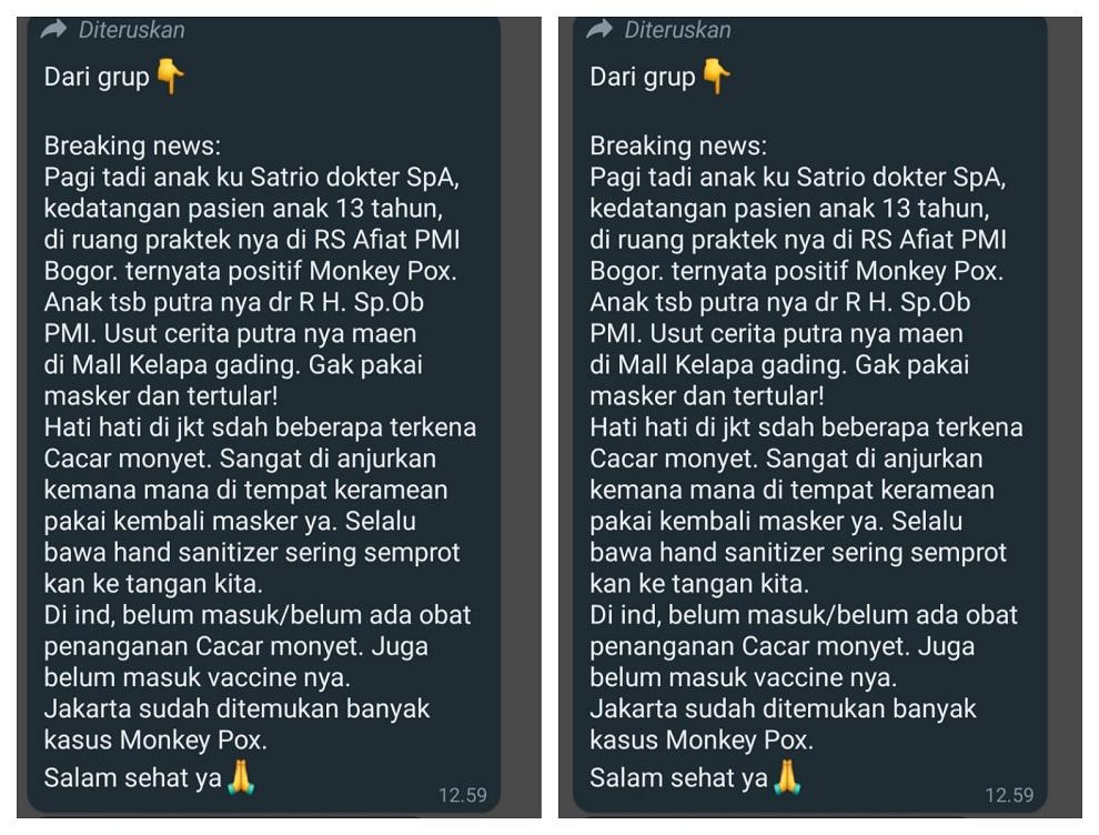 "Hoaks. Itu bukan Mpox (Cacar Monyet). Kita sudah berdasarkan hasil laboratorium dari Dinas Kesehan Kota Bogor," kata Humas PMI, Habib Priyono saat dihubungi TribunnewsBogor.com, Rabu (1/11/2023).
