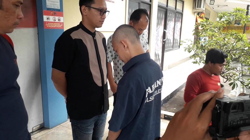Pelaku tampak terus menunduk dengan memasang wajah gelisah sambil mengenakan baju tahanan dan tangan diborgol.