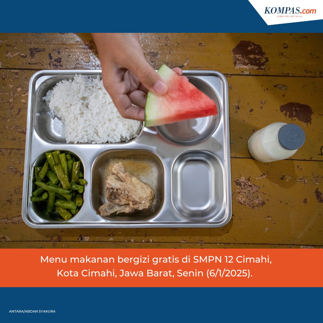 Dikutip dari Kompas.com, MBG di SMPN 12 Cimahi, Jawa Barat terdiri dari nasi, olahan ayam kuah, sayur kacang panjang, potongan buah semangka.