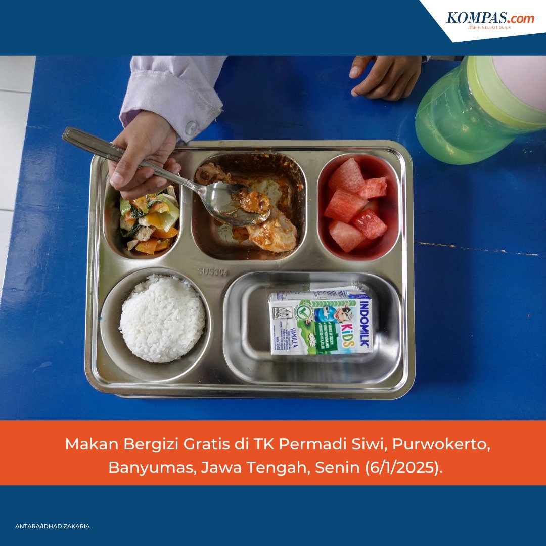 Menu makan bergizi gratis di TK Permadi Siwi, Purwokerto, Banyumas, Jawa Tengah tampak dilengkapi dengan susu.