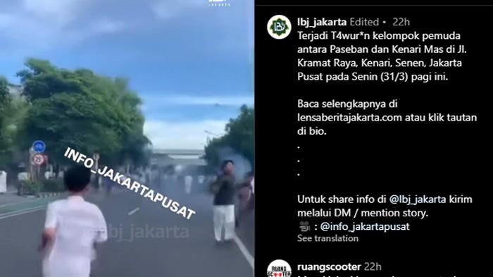 Video yang dinarasikan dugaan tawuran antar pemuda di Jalan Kramat Raya, Senen, Jakarta Pusat viral di media sosial.