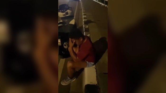 Dalam video tersebut, pelaku nampak mengenakan baju berwarna merah dan mengenakan celana pendek sedang duduk di trotoar jalan.