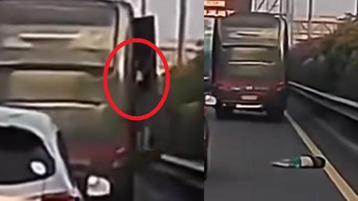Dalam video menunjukan seorang anak kecil jatuh dari bus TNI AD di KM 12 A Tol JORR.