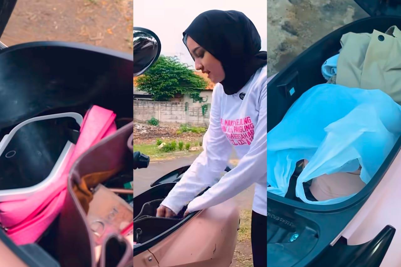 Semua perlengkapan tata rias—mulai dari foundation, brush, lipstick, hingga cermin kecil—tertata rapi di dalam bagasi motornya yang ternyata lega banget.