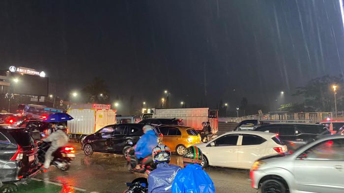 Terpantau laju kendaraan kendaraan tersendat yang disebabkan tingginya volume kendaraan pada jam sibuk sore hari ini.