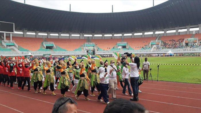 Pantauan TribunnewsBogor.com, para peserta lomba senam Pancakarsa menunjukkan kemeriahannya lewat gerakan maupun kostum.