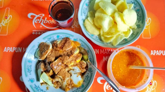 Satu piringnya berisi lontong, tahu goreng setengah matang, kentang rebus, dan telur rebus, lalu diguyur sambal kacang.